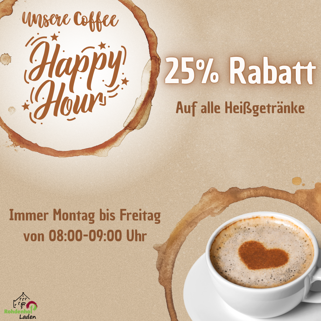 Kaffee- & Tee-Fans aufgepasst: Unser Rohdenhof-Café-Team bereitet euch von 8:00Uhr bis 9:00 Uhr leckere Heißgetränke zum Happy Hour-Preis zu.