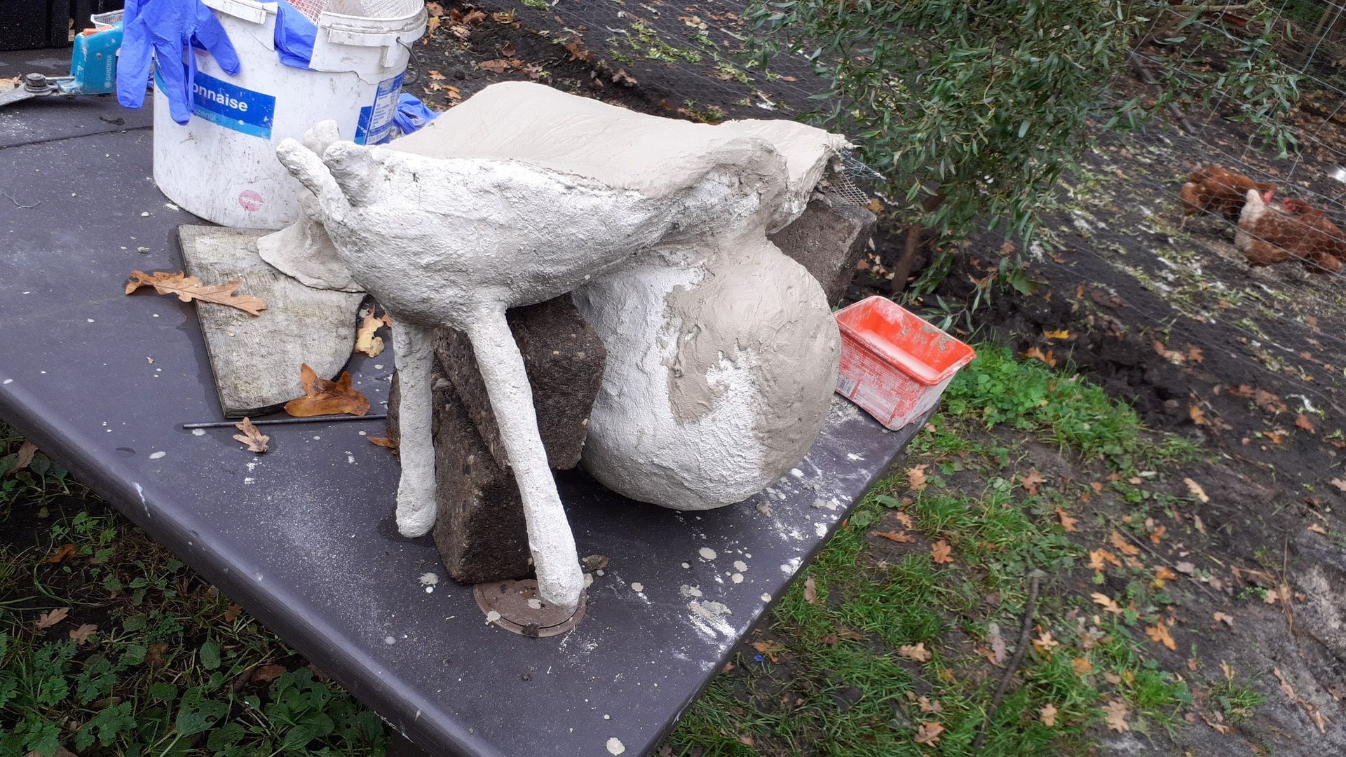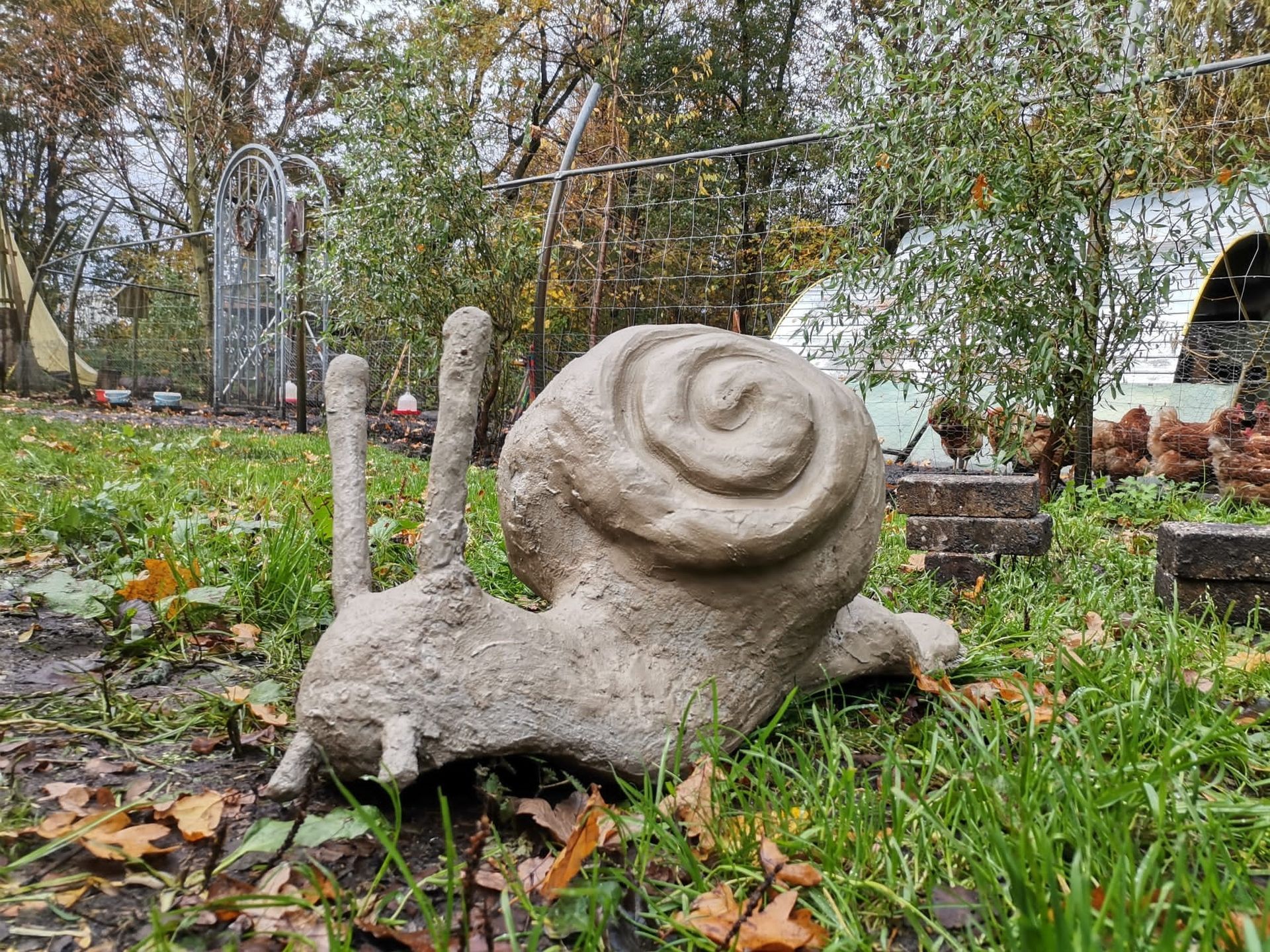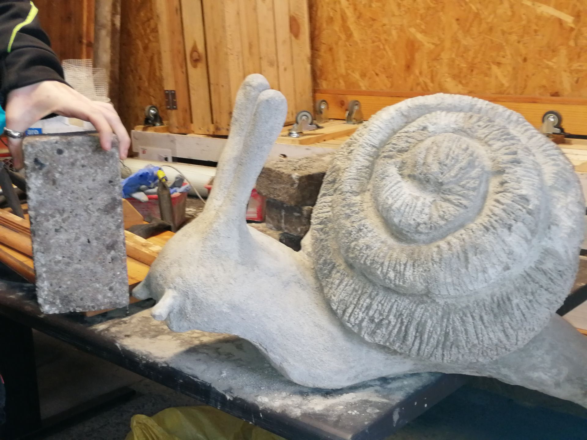 An dieser Riesen-Garten-Schnecke arbeitet Merle seit vergangenem Sommer, denn aufgrund der Größe, des Gewichtes und v.A. den Eigenschaften des Materials war jeder einzelne Arbeitsschritt mit viel Aufwand, Geschick und Geduld verbunden. Merle sieht dies aber positiv: So kann sie ihre Hauptaufgabe im Garten weiterführen und das Projekt zwischendurch nutzen, wenn wenig zu tun ist oder wenn sie mal eine „Auszeit“ braucht.