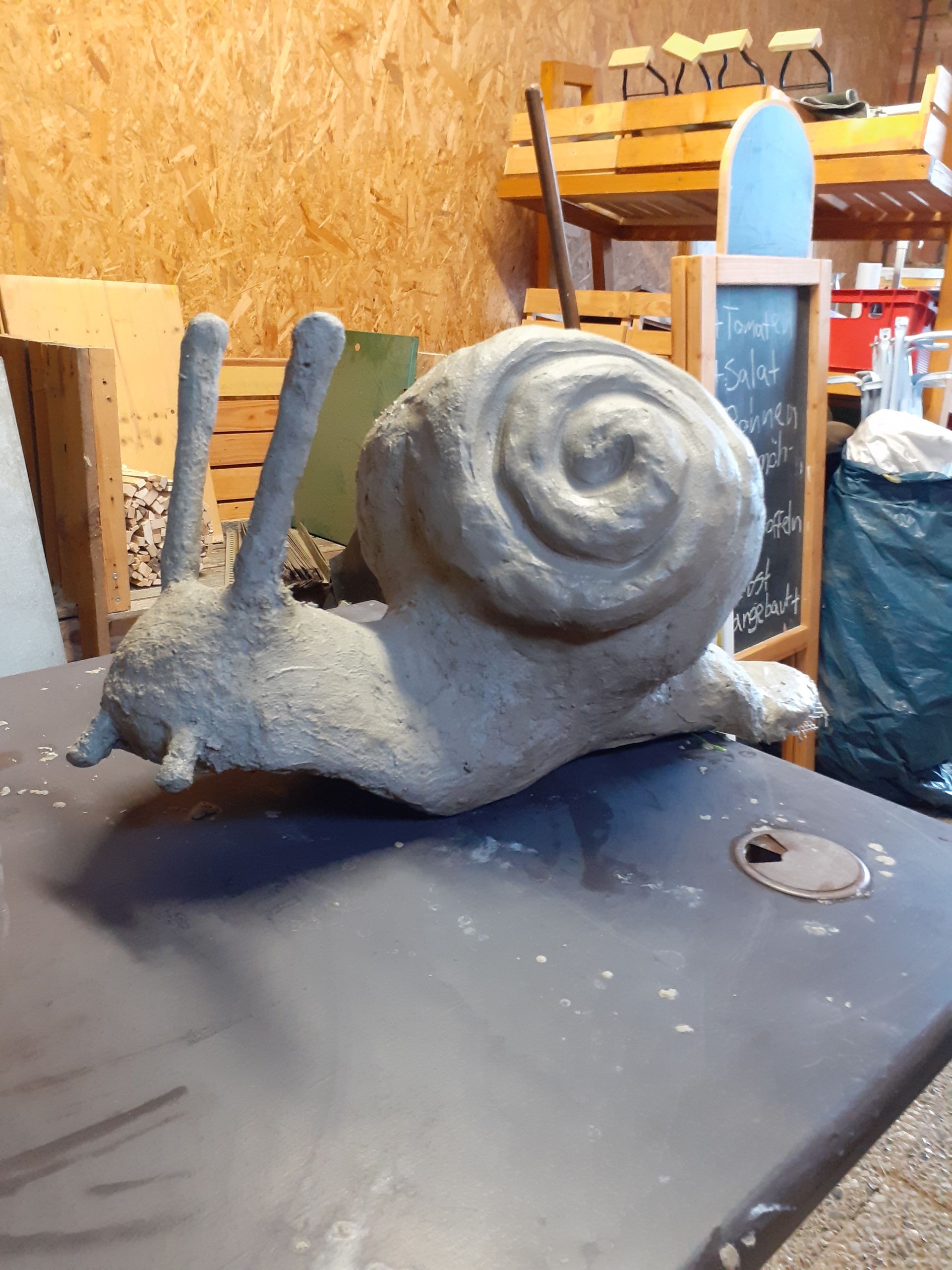 Der aktuell noch grauen Schneckzilla fehlt es jetzt noch an Farbe. Um das zu ändern wird Merle den Zement-Mörtel in den kommenden Tagen noch farblich bemalen. Die endgültige Farbwahl hat sie noch nicht getroffen, fest steht aber: es soll natürlich wirken = bräunlich-gelblich-ockerfarben. Wie genau, ergibt sich durch das Farbangebot im Fachmarkt.