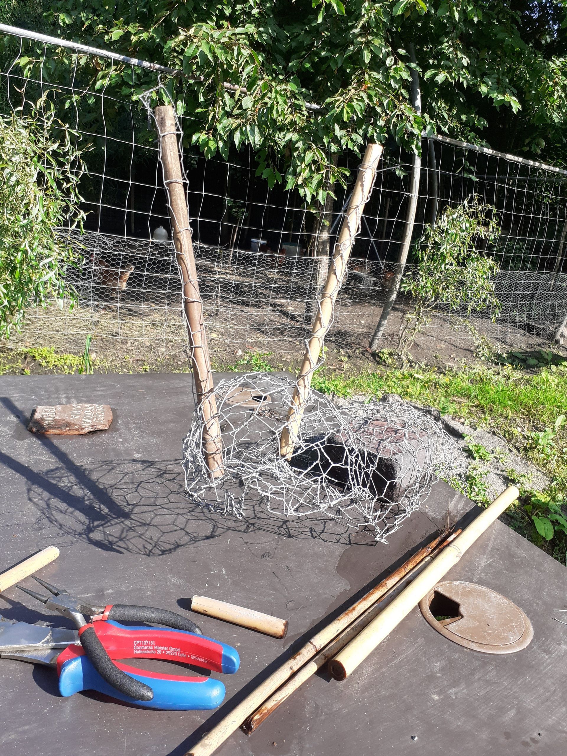 Für die Grundform hat sie mit Hühnerdraht sowie Armierungsgitter eine Schnecke modelliert. Den „Schwerpunkt“ hat sie durch einen gezielt in Schneckzillas Bauch gesetzten Ziegelstein erreicht. Die 2 Fühler am Schneckenkopf waren dann die erste große Herausforderung, die sie mit Hilfe von 2 gitterumwickelten Bambusstäben gelöst hat.
